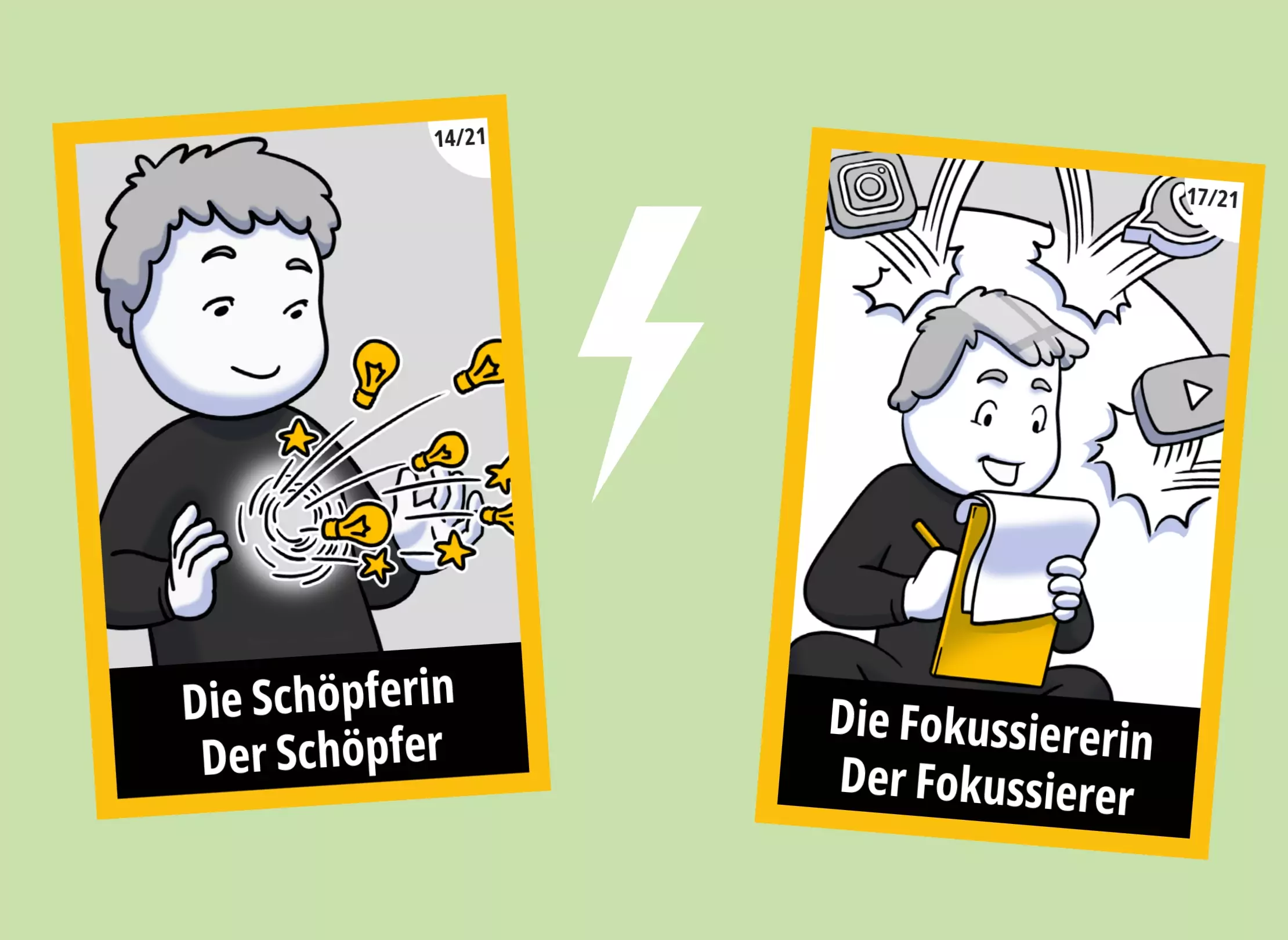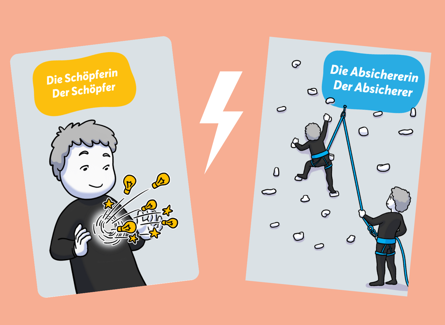 Spieler im Konflikt: Der Schöpfer bringt Ideen, Visionen und den Wunsch, etwas Eigenes zu gestalten. Der Absicherer meldet Bedenken, warnt vor Unsicherheit oder Kontrollverlust.