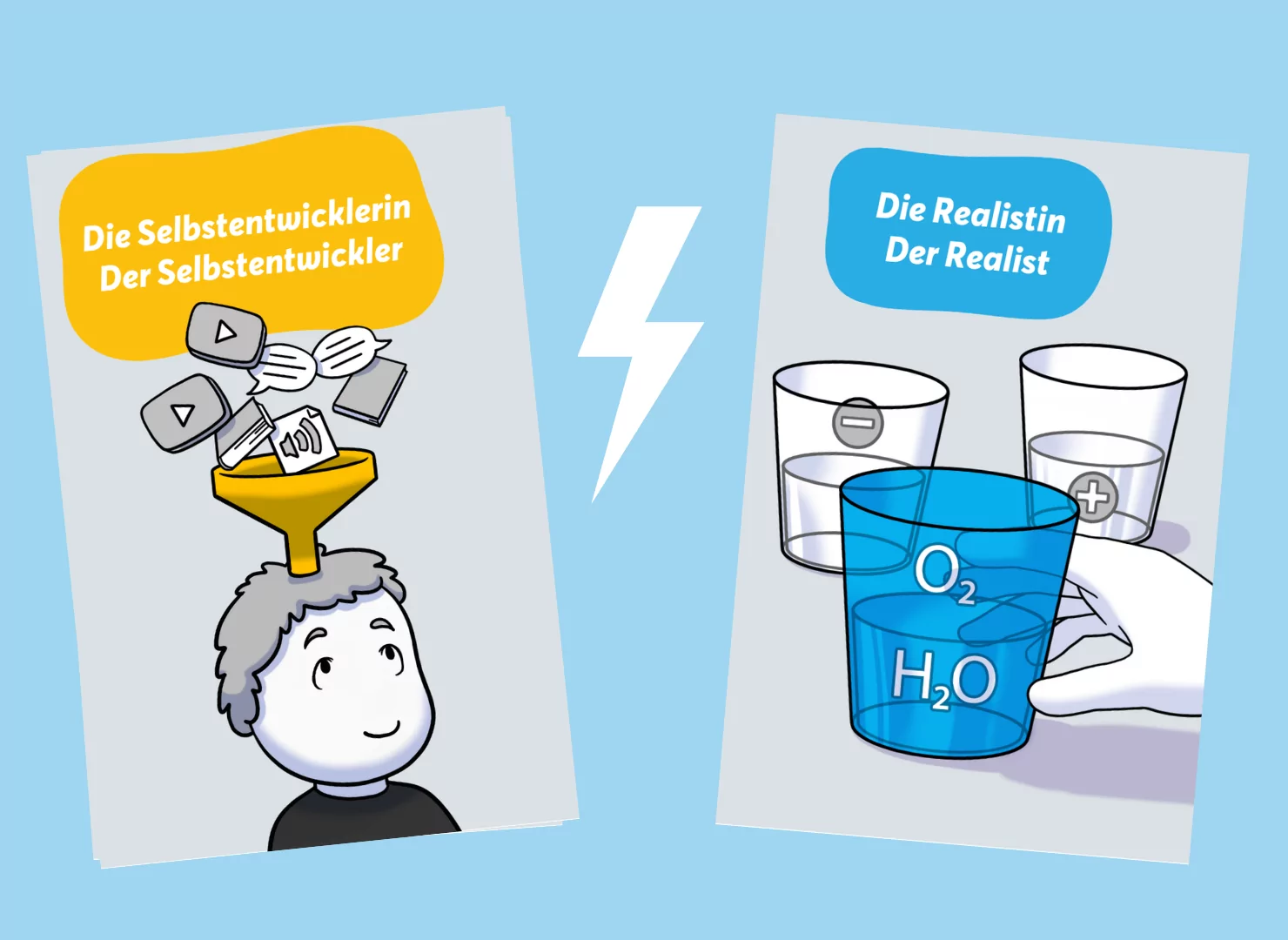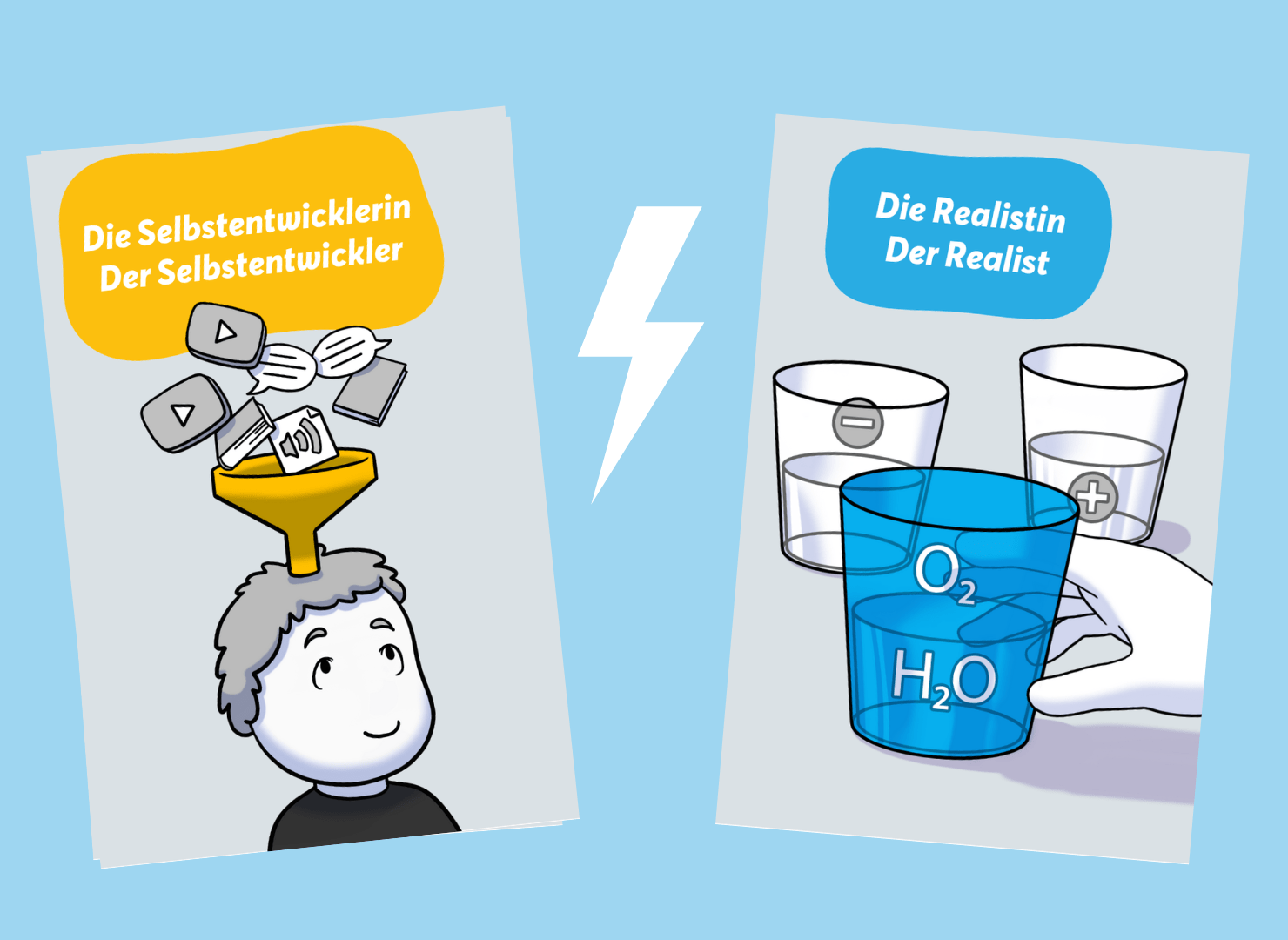 Spieler im Konflikt: Der Selbstentwickler spürt den Wunsch nach innerem Wachstum, Ausrichtung und Sinn. Er stellt Fragen wie „Was ist wirklich meins?“ oder „Wofür stehe ich auf?“ – doch der Zweifler grätscht dazwischen, verunsichert, stellt infrage, zieht jede Regung in Zweifel.