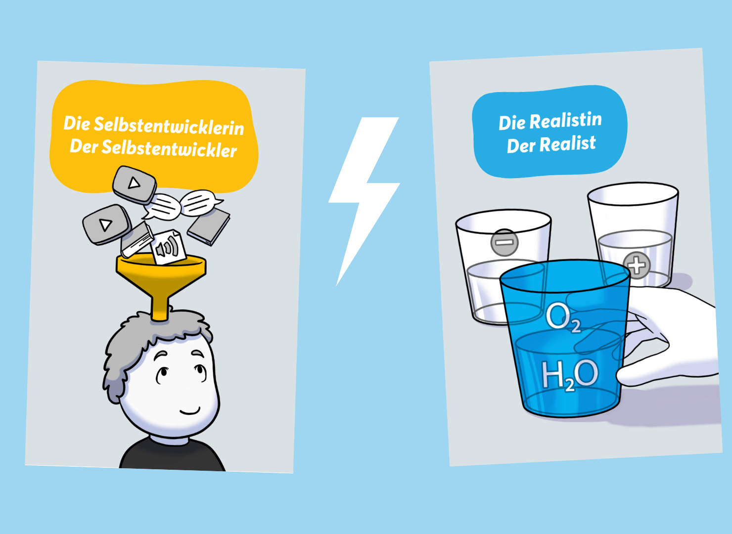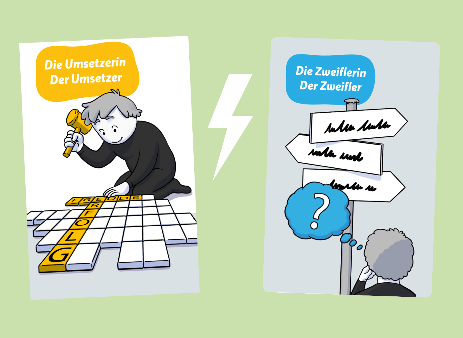 Spieler im Konflikt: Der Umsetzer will loslegen, ins Handeln kommen, die Dinge anpacken. Der Zweifler meldet sich direkt mit inneren Fragen, Unsicherheit und Kritik.