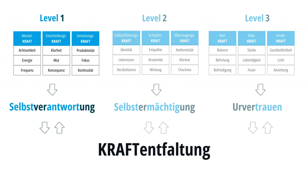 In Level 1 geht es um das Fundament. Denn ohne MentalKRAFT, EntscheidungsKRAFT und UmsetzungsKRAFT sind all deine Ideen und Veränderungsvorhaben kaum machbar.Â